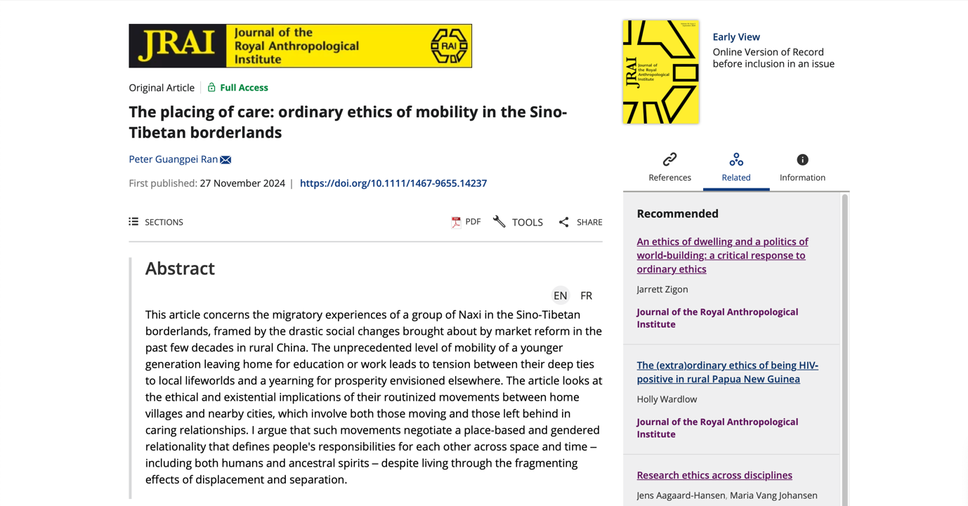 祝贺本院冉光沛老师在国际顶级人类学期刊JRAI(Journal of the Royal Anthropological Institute)发表文章《何处安放关怀:关于汉藏边地流动的日常伦理研究》。