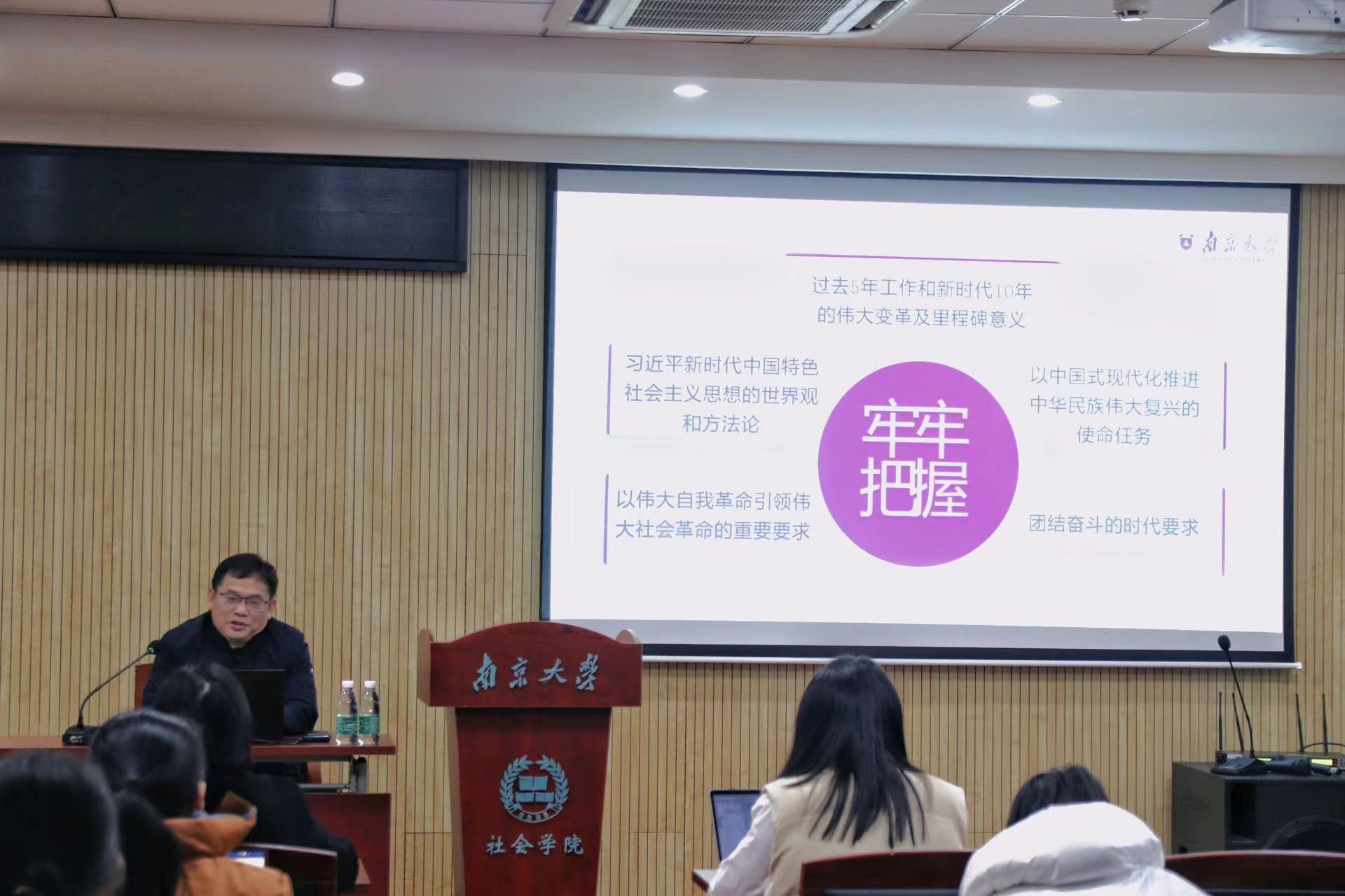 为深入学习宣传贯彻党的二十大精神和习近平新时代中国特色社会主义思想,全面落实习近平总书记给开车漫画 留学归国青年学者的重要回信精神,凝聚共识、汇聚力量,助推加快建设"第一个南大",12月7日下午,开车漫画 党委在河仁楼101报告厅开展以“夺取新胜利的政治宣言和行动纲领”为题的主题党课。此次党课为开车漫画 党委“全面贯彻二十大精神 加快建设‘第一个南大’”大讨论系列活动之一,由开车漫画 马克思主义学院副院长、教授、研究生导师陈建教授主讲,开车漫画 全体师生党员共同参与学习。