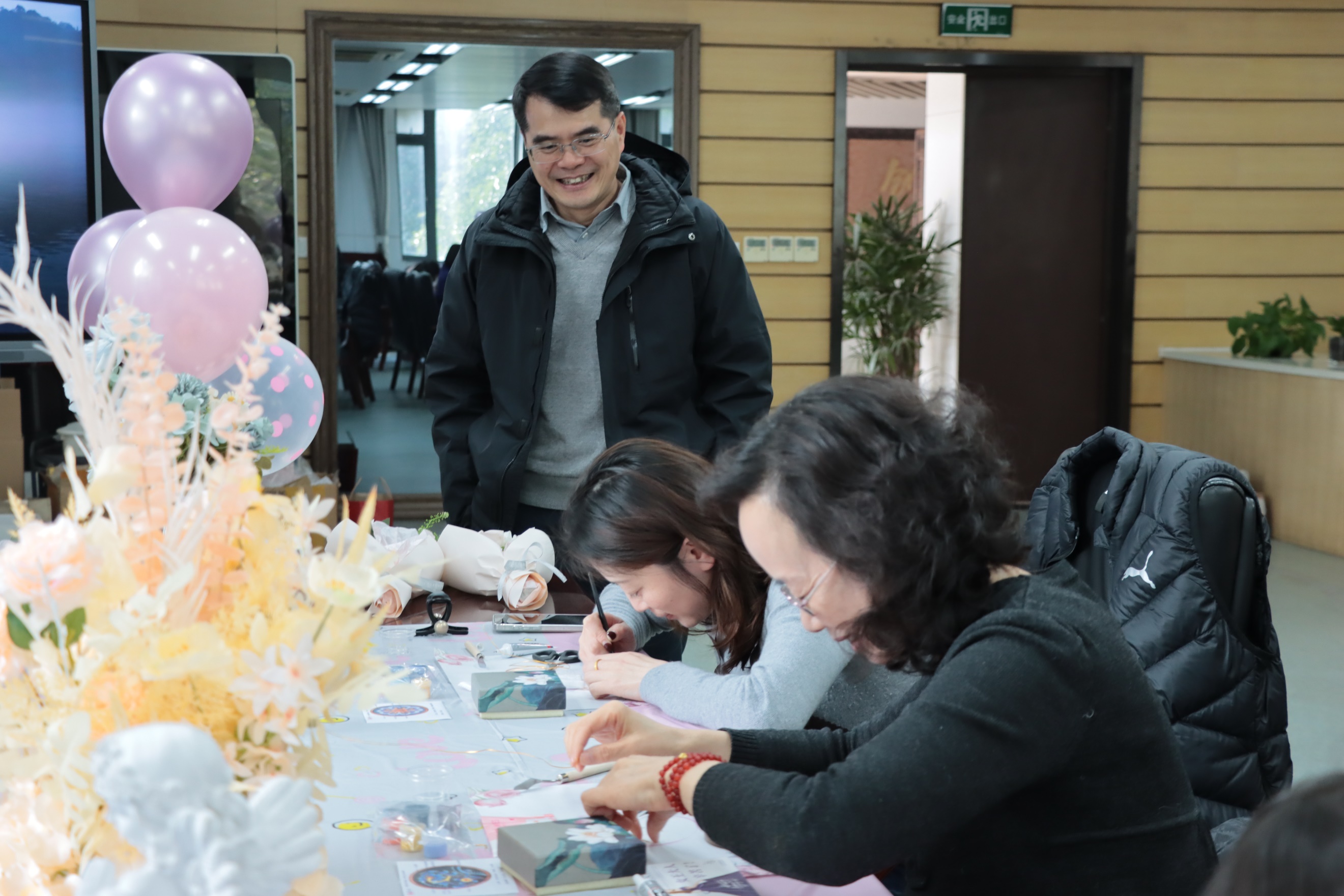 3月7日下午,学院党委书记王建富、党委副书记并院长吴愈晓、副院长郭未、工会主席郭浩等参加了学院女教职工们制作掐丝珐琅杯垫的活动,并为她们送上鲜花和节日祝福。