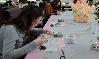 绘图、掐丝、点蓝、封层,用金属勾勒轮廓,用釉料填充色彩。女教职工认真地做着每一个步骤,看起来简单,做起来难。她们全神贯注粘丝,小心翼翼点蓝,每一笔线条都是一份专注,每一抹颜料都是一份热爱。看似普通的金丝,在她们一番弯折处理后,构成了一个个精巧细致的图案,再搭配色彩鲜艳的釉料,呈现出特有的国画意境美。在快乐的劳动中,女教职工们体会着节日的喜悦。