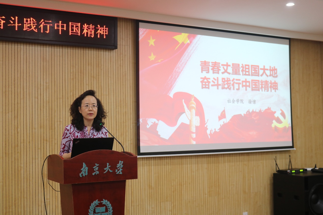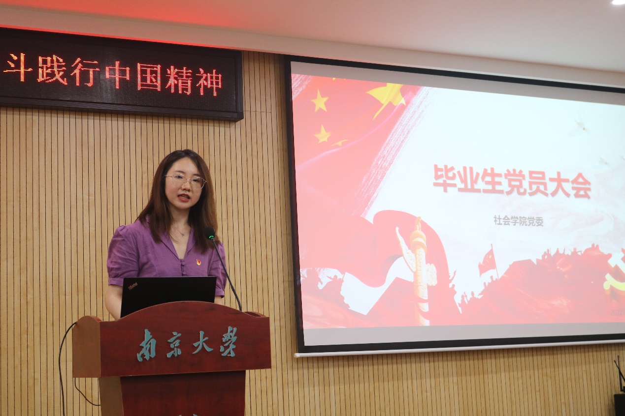 本科生党支部的孙悦同学回忆了自己担任支部副书记参与党建工作的历程与收获,从“勤学理论树信念”、“丰富形式促成长”和“发挥作用强建设”3方面汇报了本科生党支部在学习重要精神、开展党史教育、举办主题活动等方面取得的扎实成果。作为光荣的共产党员,她勉励自己向南大归国青年教师学习,爱国为民,肩扛责任;作为社院学子,她立志关切社会,回馈培养,“以专业所学讲好中国故事,在研究方向上给出中国答案”。
