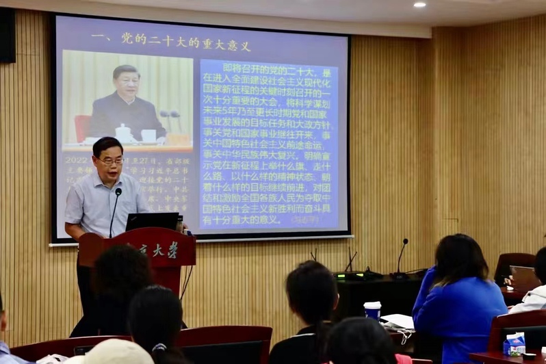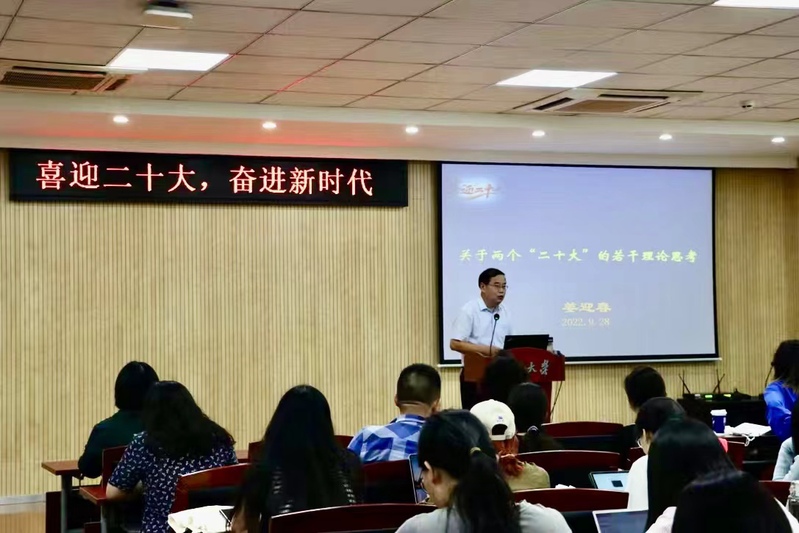 习近平总书记指出:“即将召开的党的二十大,是在进入全面建设社会主义现代化国家新征程的关键时刻召开的一次十分重要的大会,将科学谋划未来5年乃至更长时期党和国家事业发展的目标任务和大政方针,事关党和国家事业继往开来,事关中国特色社会主义前途命运,事关中华民族伟大复兴。”为增强师生党员听党话、跟党走的坚定信心,喜迎党的二十大胜利召开,9月28日下午,开车漫画 党委在河仁楼101报告厅开展以“关于两个‘二十大’的若干理论思考”为题的主题党课。此次党课为开车漫画 党委“喜迎二十大,奋进新时代”系列活动之一,由开车漫画 信息管理学院党委书记,哲学系教授、博士导师姜迎春同志主讲,开车漫画 全体师生党员共同参与学习。