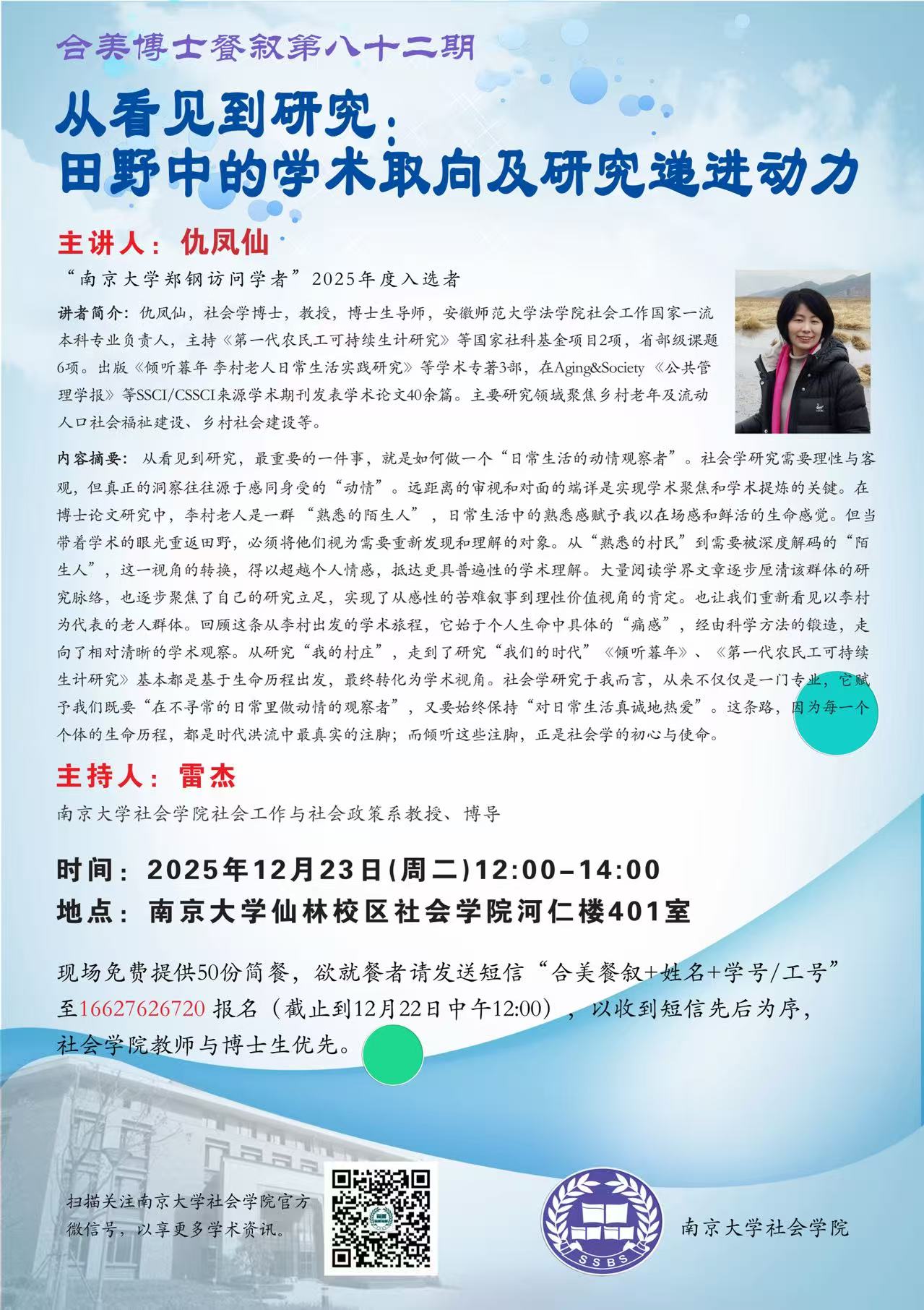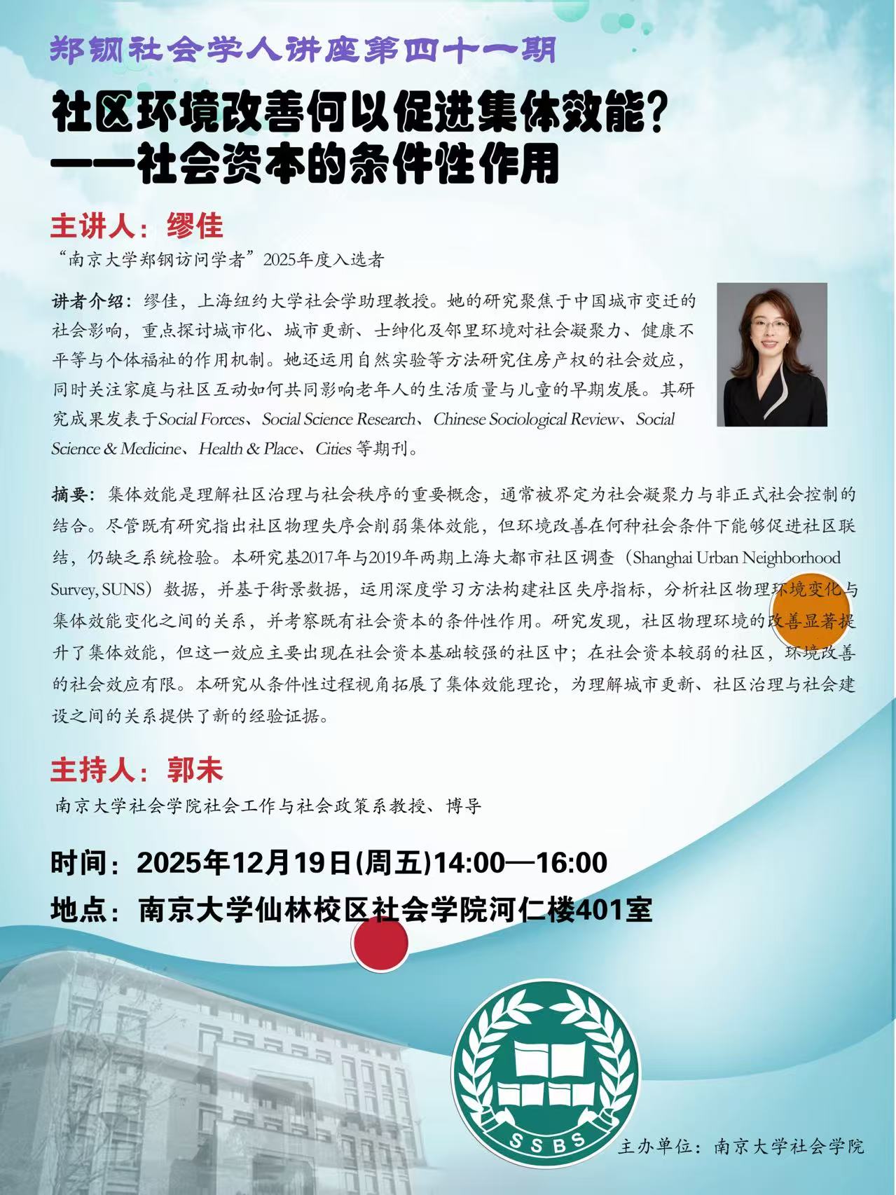 202620012026年“钟山群学青年学者论坛” 征文启事2026年“钟山群学青年学者论坛”征文启事尊敬的各位学界同仁:“钟山群学青年学者论坛”是由南京大学杰出客座教授谢宇教授倡导、南京大学社会学院主办的关于社会科学前沿方法与应用研究的学术研讨会,旨在为社会学及相关学科的青年学者搭建高水平、跨学科的学术交流平台,推动社会学实证研究和量化方法的发展创新。秉持论坛创办的初衷,第二届“钟山群学青年学者论坛”定于2026年3月7-8日在南京大学仙林校区举办。诚挚邀请学界同仁参加会议,交流学术思想,砥砺学术进步。论坛即日起向学界同仁征集论文,现将有关事项通知如下:论坛主题:社会科学前沿方法与应用论文投稿要求:所提交论文应未在国内外刊物上发表过。社会学、人口学、社会工作等相关领域的量化研究。稿件第一页应包括以下信息:论文标题、作者姓名、单位、职称、联系电话、通讯地址、电邮地址。钟山群学论坛意在为社会学青年学者打造学术交流平台,对参会论文发言人做出如下限制:中国国籍,年龄35岁以下,博士在读或者尚未获得长聘(副教授)的青年学者。会议时间地点:时间:2026年3月7-8日(周六、周日)地点:南京大学仙林校区(江苏省南京市栖霞区仙林大道163号)论文提交时间和