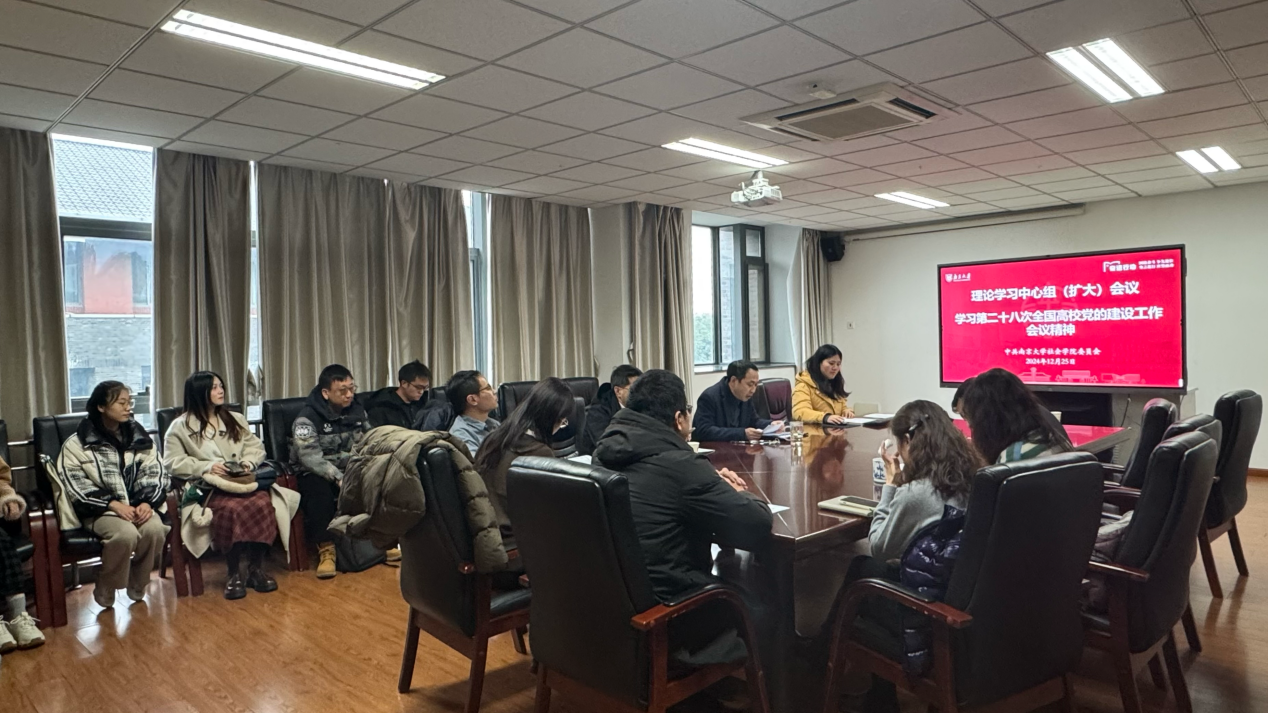 12月25日,社会学院党委召开理论学习中心组(扩大)会议,传达学习第二十八次全国高校党的建设工作会议精神,部署贯彻落实工作。社会学院党委书记王建富主持会议并作领学发言,学院党政班子成员及各党支部书记参加学习。