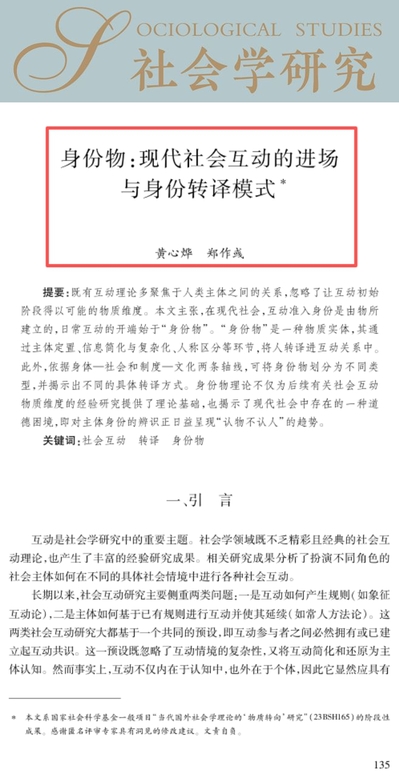 开车漫画黄心烨同学、郑作彧教授在《社会学研究》2025年第6期发表《身份物:现代社会互动的进场与身份转译模式》一文。