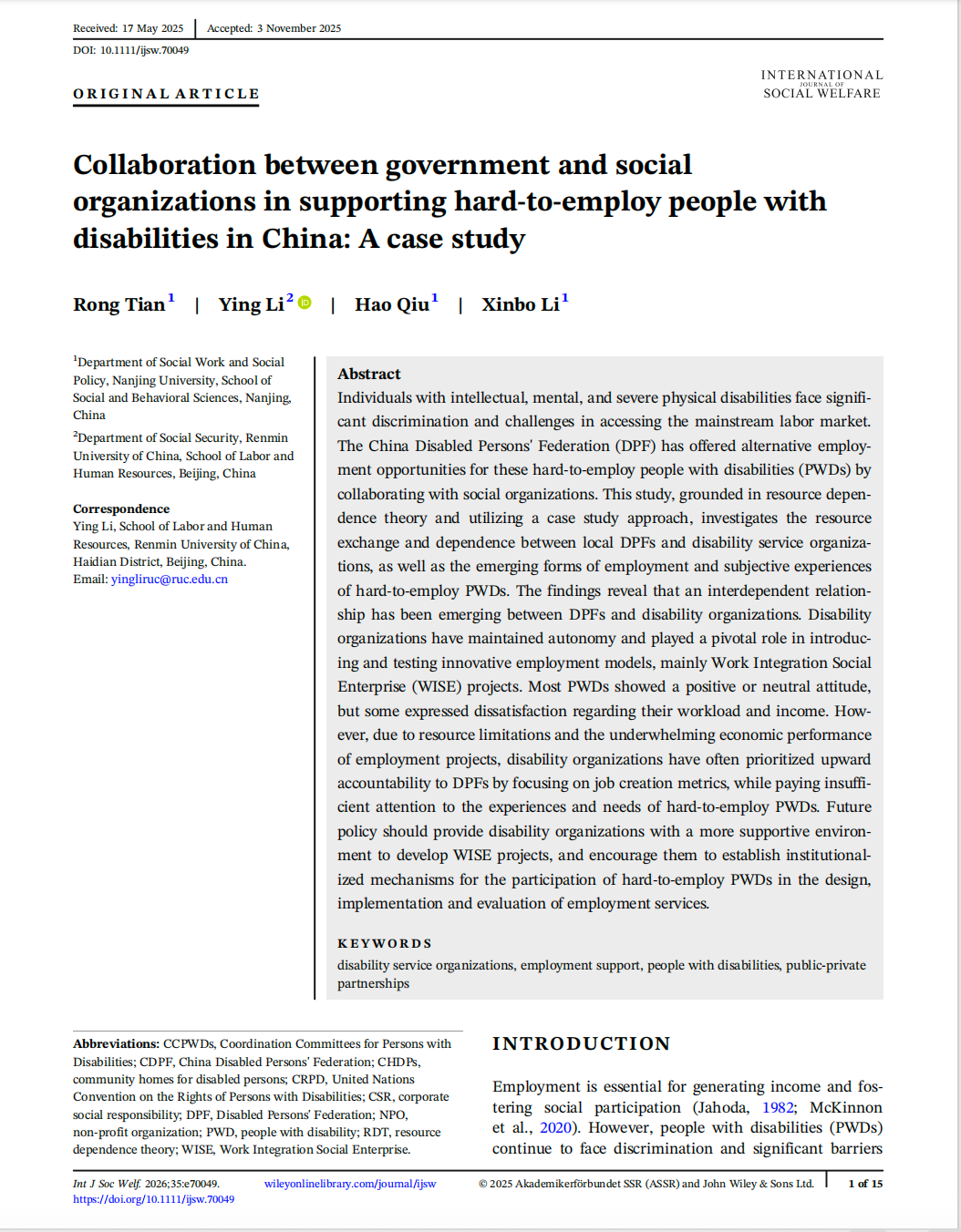 Tian, R., Li, Y., Qiu, H., & Li, X. (2026). Collaboration between government and social organizations in supporting hard-to-employ people with disabilities in China: A case study. International Journal of Social Welfare, 35(1), e70049. //doi.org/10.1111/ijsw.70049