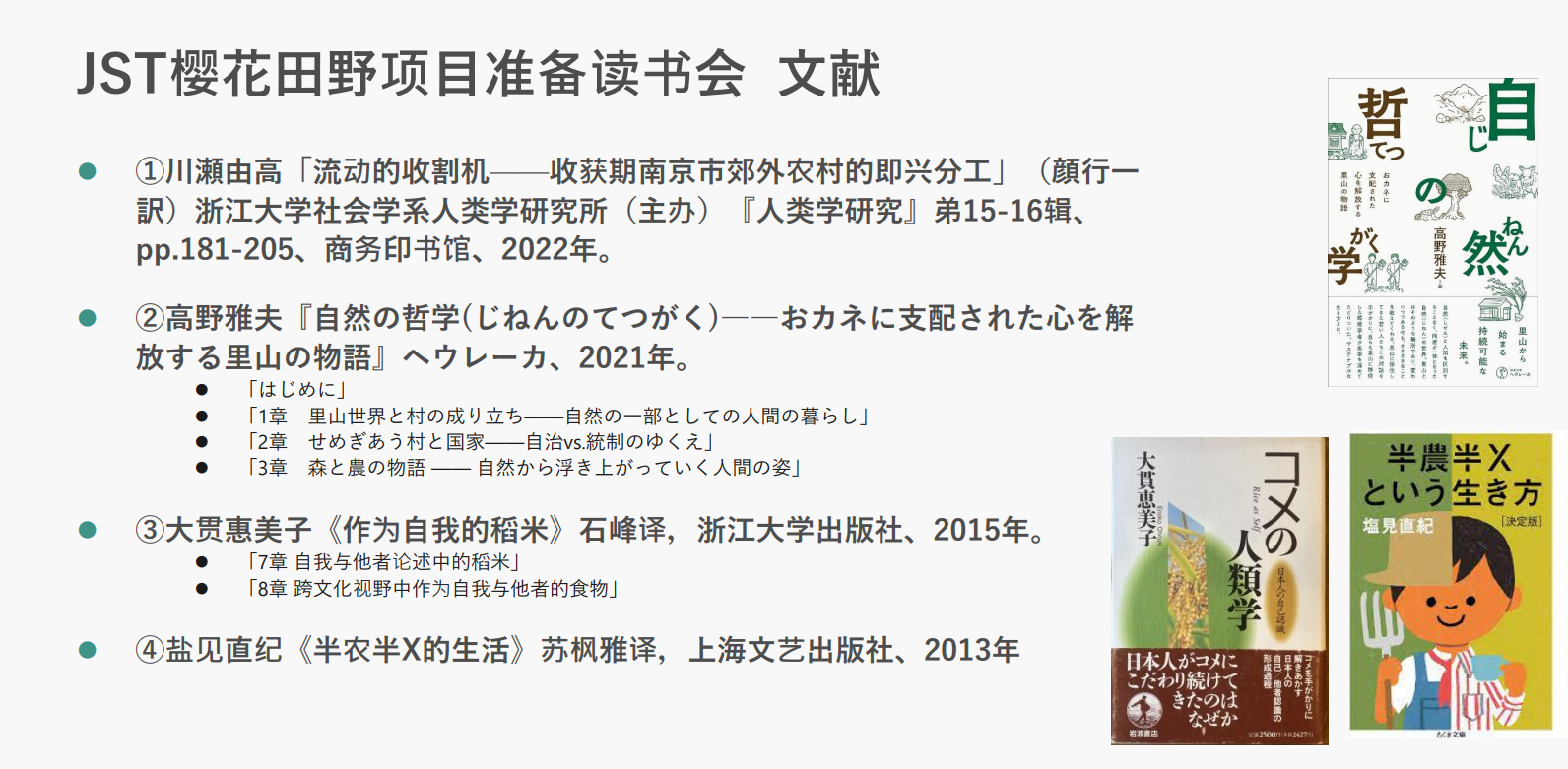 在项目开始之前,开车漫画 师生根据日方老师提供的书单展开了多次线上读书会交流活动。其中包含《流动的收割机》(川濑由高2022)、《作为自我的稻米》(大贯惠美子2015)、《半农半X的生活》(盐见直纪2013)、《自然的哲学》(高野雅夫2021)等。通过阅读这些书籍,一方面,我们就日本农村、农业以及农民的情况积累了一定的基础知识,并对稻米与日本人的身份认同、里山与日本农村的发展等有了基本的理解。另一方面,从中日对比的视角,我们也发现不同于中国农村的日本农村的发展特点,并由此产生了许多疑问。这些都有待实际赴日之后进行逐一确认和解答。