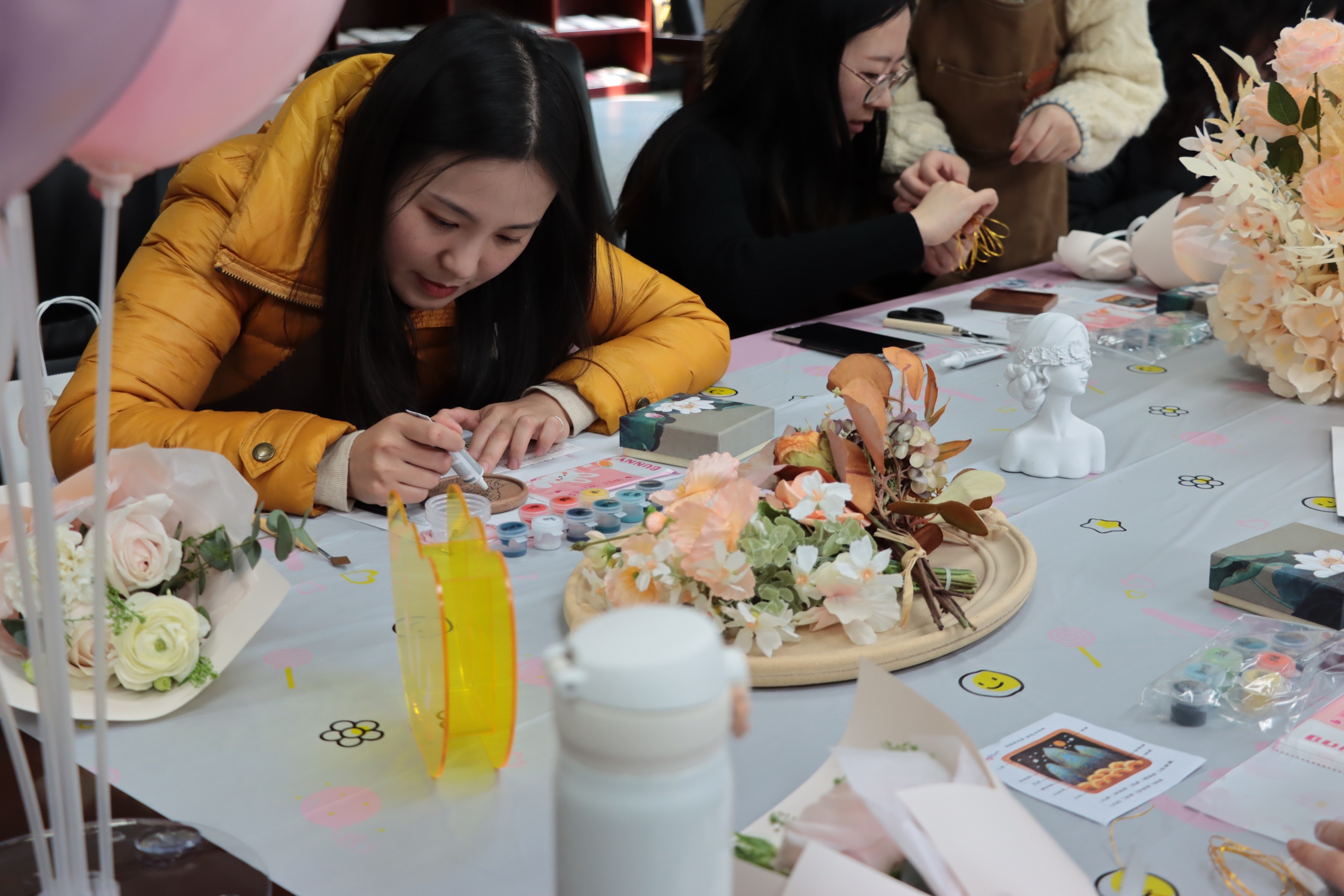 3月7日下午,学院党委书记王建富、党委副书记并院长吴愈晓、副院长郭未、工会主席郭浩等参加了学院女教职工们制作掐丝珐琅杯垫的活动,并为她们送上鲜花和节日祝福。