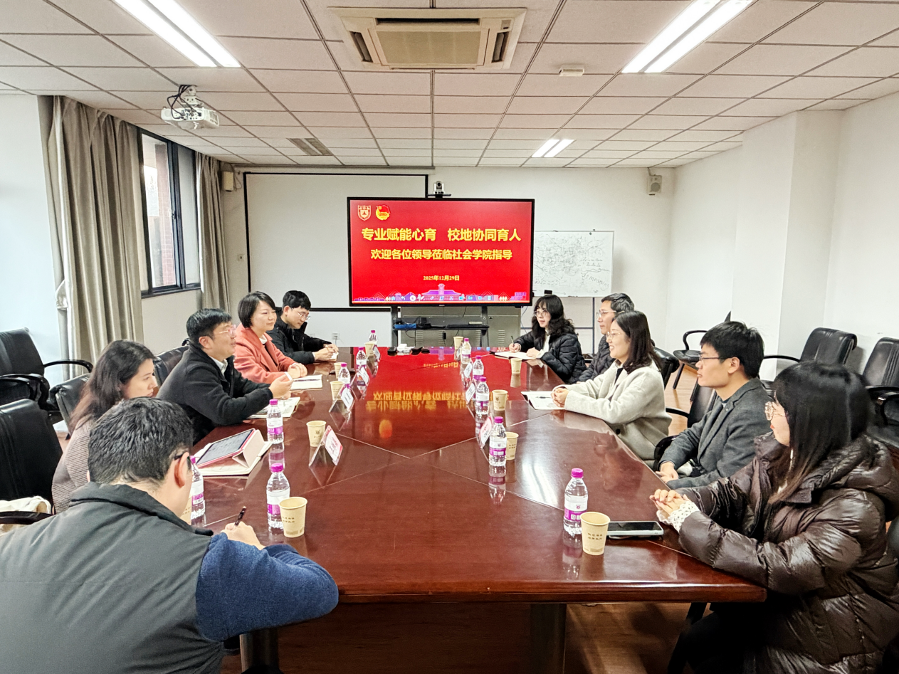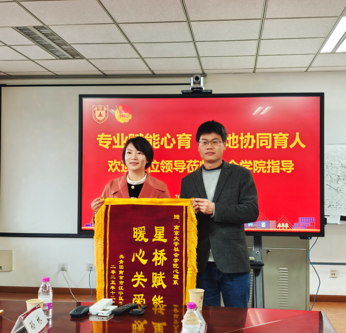 2025年12月29日,南京市江宁区团区委书记陆瑶、副书记李林一行专程来到南京大学社会学院,向我院心理学系赠送“星桥赋能,暖心关爱”锦旗,对佘壮老师课题组在江宁区开展“星桥计划”孤独症儿童关爱公益项目表示诚挚感谢。南京大学团委书记曹晨、副书记王维嘉,社会学院党委副书记曹慧中、院团委书记邵晓宁,心理学系副主任李中权,以及佘壮老师课题组部分成员出席座谈交流活动。