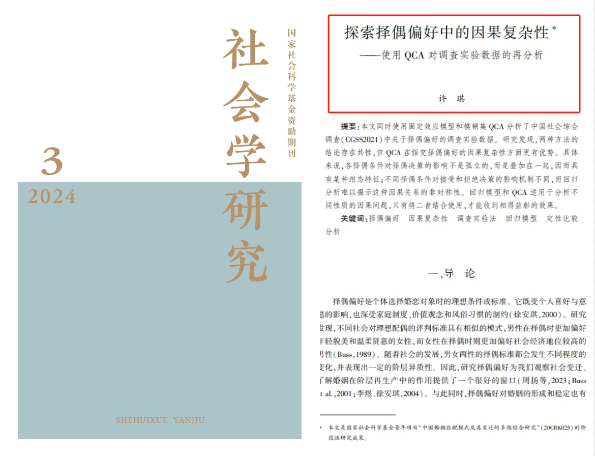 我院许琪教授在《社会学研究》2024年第3期发表《探索择偶偏好中的因果复杂性——使用QCA对调查实验数据的再分析》一文。