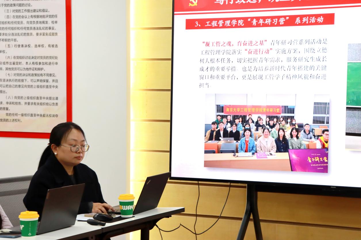 随后,李敏分享了全国高校“百个研究生样板党支部”的建设心得。与会师生共同观看了工程管理学院博士生党支部风采展示视频,李敏重点介绍推动党建与科研目标深度融合的实践路径,包括实施院党委委员联系支部的标准化机制、支部内部建立严谨的考勤制度、创新运用“党员成长记录卡”进行过程性培养等。李敏特别展示了支部品牌项目“博士生学识论坛”,围绕不同理论学习主题,衍生开展“青年研习营”等系列活动,有效激发了博士生党员在深学细悟中确立科研报国志向的内生动力。