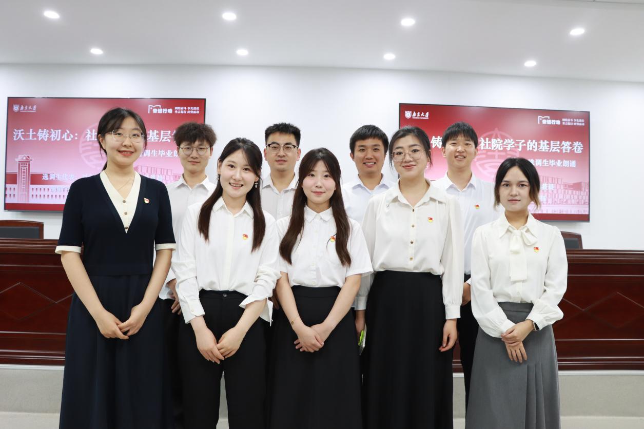 九位即将奔赴基层的选调生代表在带来“沃土铸初心:社院学子的基层答卷” 主题朗诵,表达了牢记初心使命,以坚定的信念扎根基层,在服务人民中实现人生价值,让青春在党和人民最需要的地方绽放绚丽之花,以实际行动诠释南大学子的责任与担当。