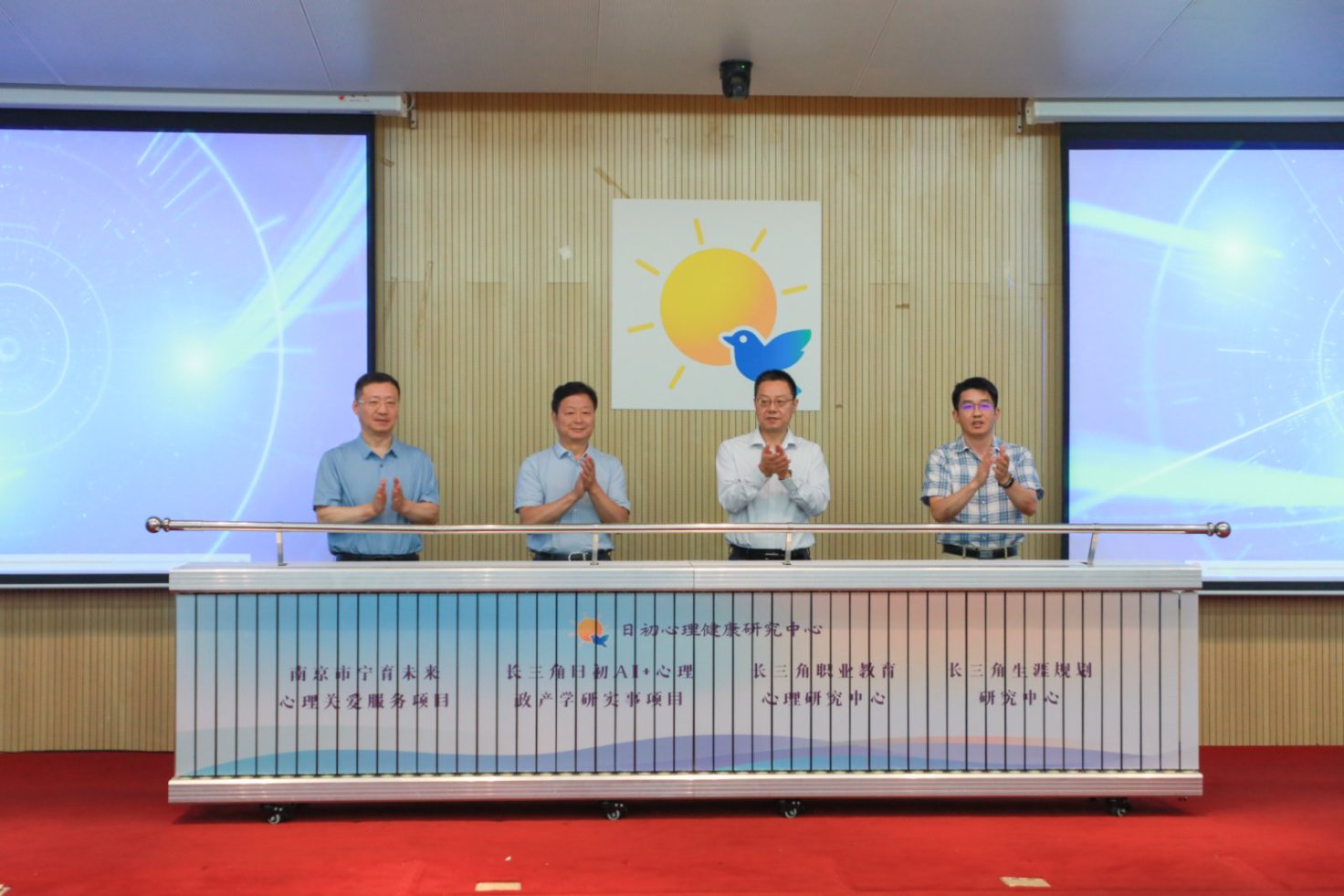 在陕西赴江苏挂职干部工作队总领队王岳主任,省卫健委医政处主任科员李永昌,南京审计大学原党委副书记、江苏省大学生心理危机预防与干预研究中心主任张建红,南京市教育局职社处处长、一级调研员黄子亮的共同见证下,多个具有战略意义的心理服务创新平台与协同项目正式启动,包括“南京市宁育未来心理关爱服务项目”“长三角日出AI+心理政产学研实事项目”“长三角职业教育心理研究中心”以及“长三角生涯规划研究中心”。系列项目的启动标志着心理健康服务体系在智能化、体系化、区域化方向上迈出了坚实的一步,也开启了政产学研用五方协同深度融合的新篇章。